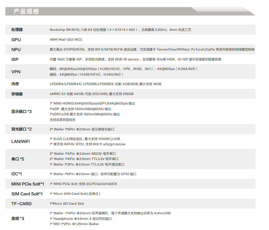 ? 集成 GPU/VPU/NPU 協處理器 :OpenGL ES3.2 /2.0,Vulkan1.1,8K@30fps H.265 /VP9 視頻解碼 ,4K@60fps H.265/H.264 視頻編碼 ,6TOPS 算力 NPU