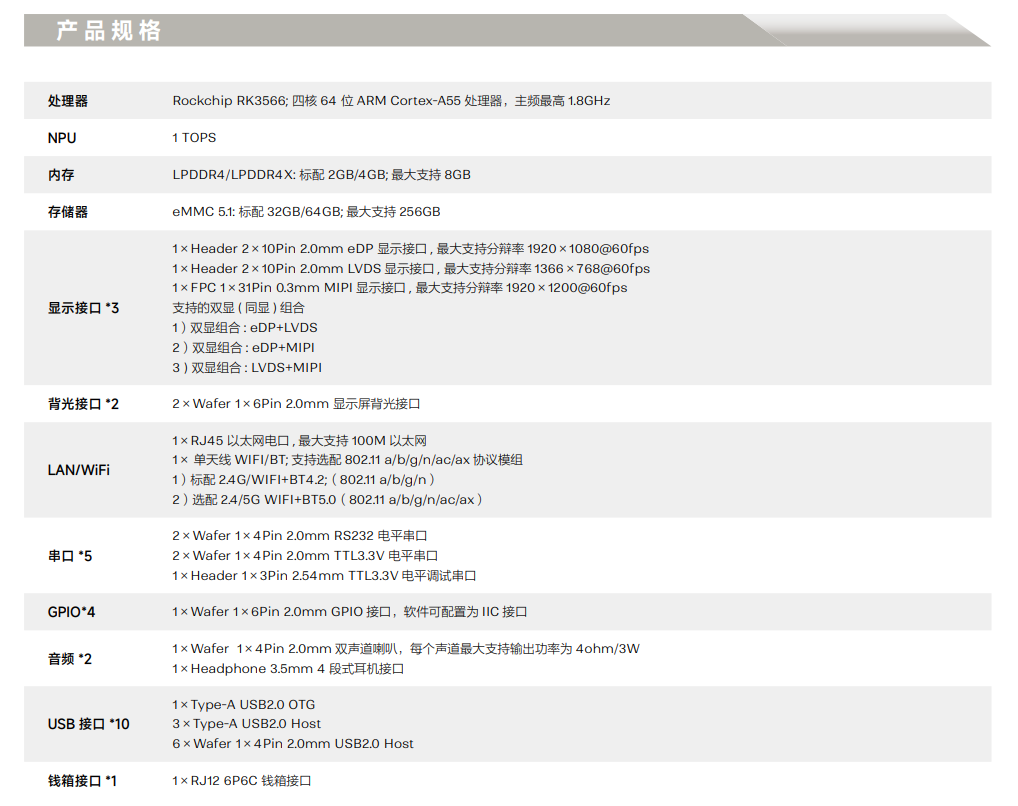 采用瑞芯微 RK3566 四核 64 位 Cortex-A55 處理器, 采用 22nm 先進工藝,具有低功耗高性能的特點。 雙核心架構 GPU,高性能 VPU 以及 NPU。支持 OpenGL ES3.2 /2.0 /1.1,Vulkan1.1;4K 60fps H.265 /H.264/VP9 視頻解碼和 1080P 100fps H.265/H.264 視頻編碼。