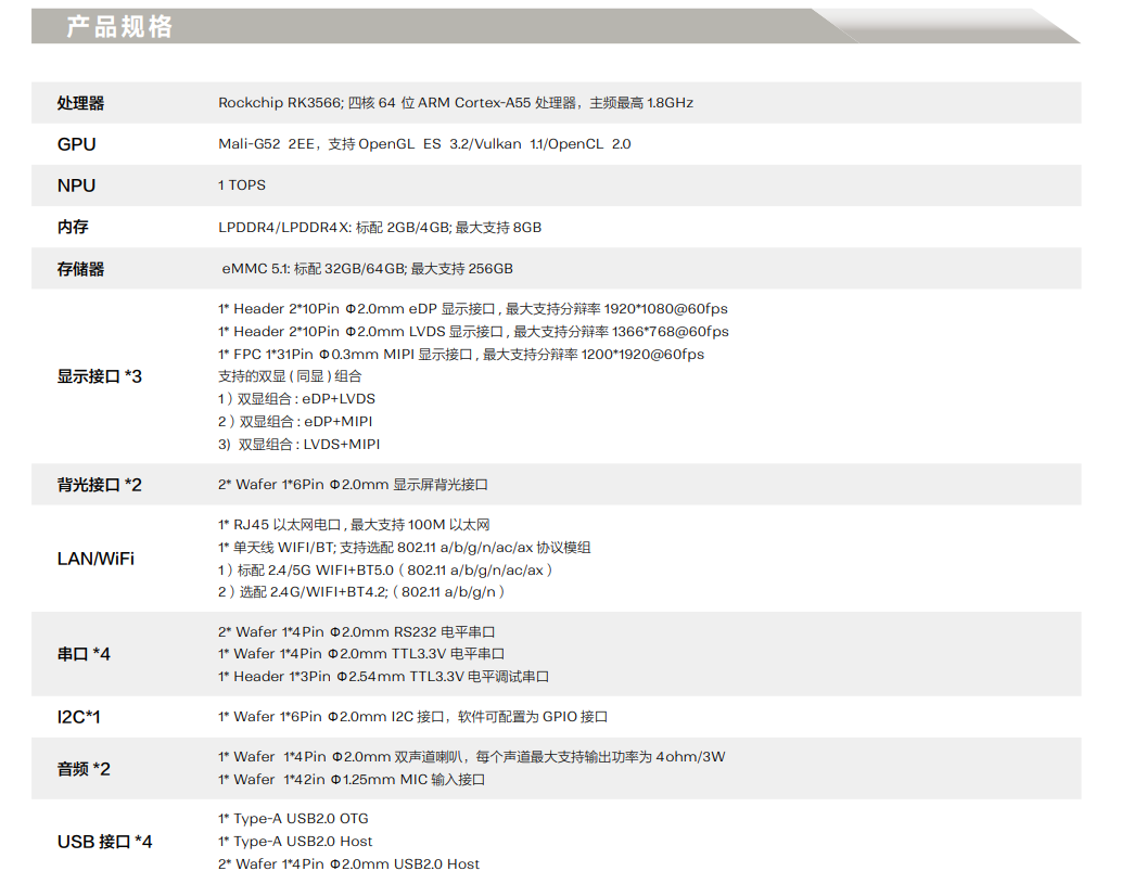 ? 采用瑞芯微RK3566 四核64 位Cortex-A55 處理器, 主頻最高1.8GHz,效能有大幅提升;采用22nm先進(jìn)工藝,具有低功耗高性能的特點(diǎn)